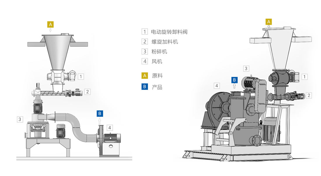 碳酸氫鈉(小蘇打)原料經由料倉下部的定量加料機均勻送入粉碎機進行超細研磨,達到顆粒細度的產品(D90:20μm或根據脫酸需要靈活調整產品粒度)被高壓風機輸送到煙氣管道並噴射融入煙氣,迅速與含酸煙氣產生化學反應。在高溫下碳酸氫鈉分解生成碳酸鈉Na2CO3、H2O和CO2。新生成的碳酸鈉Na2CO3在生成瞬間有很高的反應活性,可高效地與煙氣中的酸性物質進行反應。